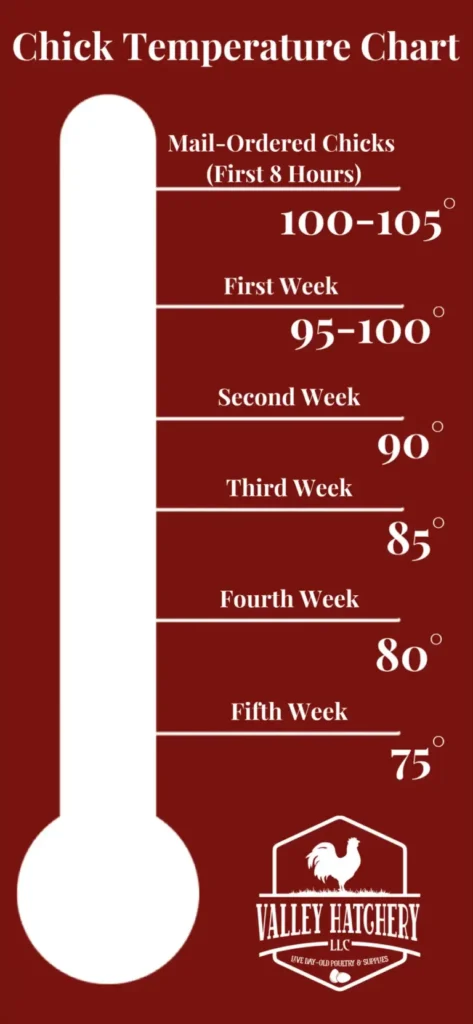 Note: Adjustments in temperature might be necessary for various types of poultry. Bantams and other small-bodied birds could benefit from a slightly elevated temperature. On the other hand, larger birds like waterfowl and Jumbo Cornish Cross, due to their rapid growth and heightened heat sensitivity, might require a slightly reduced temperature to prevent overheating.