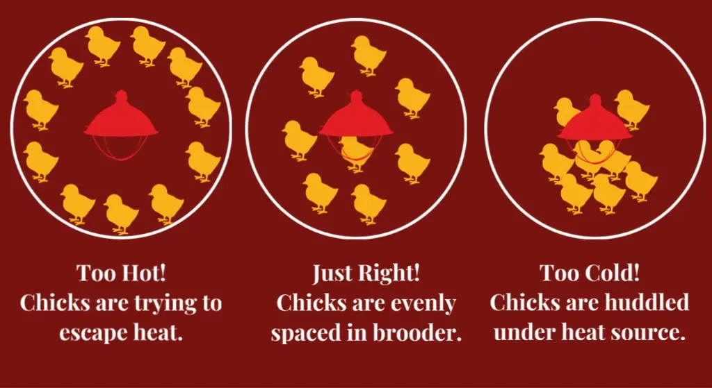 Observing your birds will indicate the conditions. Baby poultry tend to chirp loudly, group, and pile up when it’s cold, which can lead to suffocation.